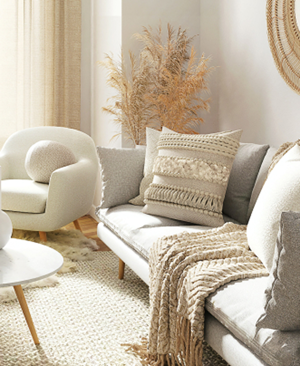 ソファの足元にオットマンを配置すれば、カウチスタイルの出来上がり。